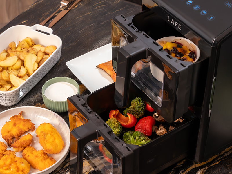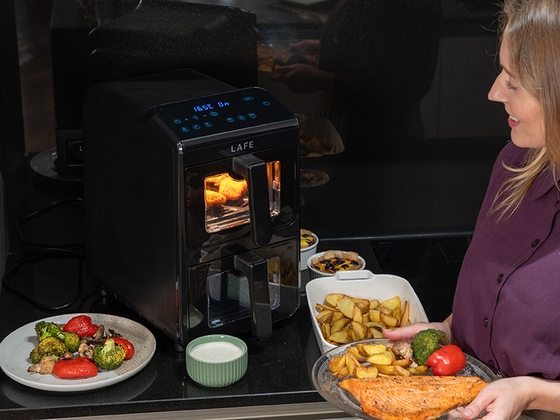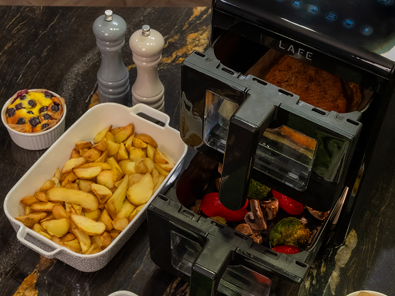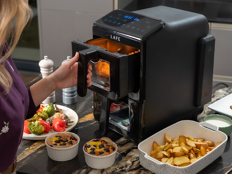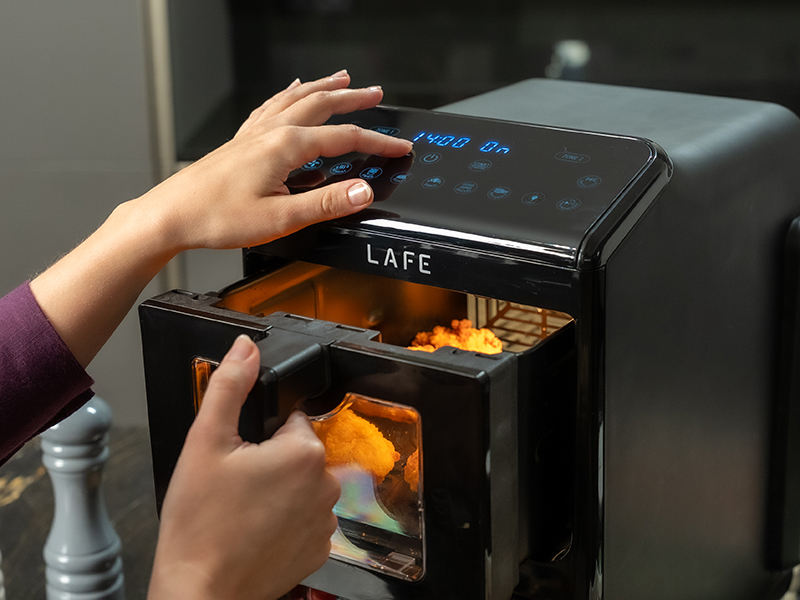 Lafe Dual Fry 10 L została wyposażona w okienka, które umożliwiają obserwację procesu pieczenia bez konieczności otwierania urządzenia. To proste i praktyczne rozwiązanie pozwala kontrolować stopień przyrumienienia potrawy, zachowując jednocześnie stałą temperaturę wewnątrz komory.